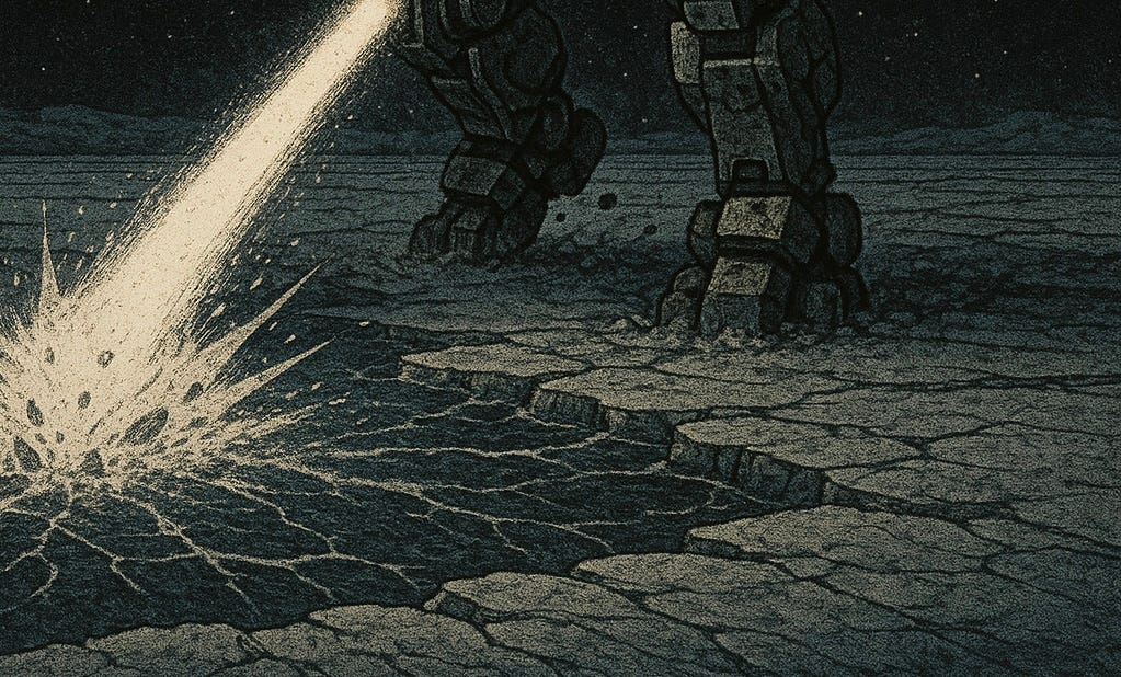 There was a flash like a camera going off. Three seconds later, the ice where Markk had been standing only a few seconds before exploded in a flash of bright chrome light, and Markk, looking back, gaped at the sheer size of the crater that was produced. It was as big as the entire outpost. An enormous scorched hole in the ice, flames licking its edges. The Daitya had clearly fired its Remote Effect Gun. Fortunately, Markk knew it could only do that once every fifteen minutes.